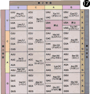 普遍暗号表。3文字続きをコドンと呼び、翻訳されるアミノ酸を指定する。1種類のアミノ酸に、複数のコドンが対応する場合が多い。