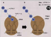 私たちは、マイコプラズマの細胞をすりつぶして試験管の中に入れ、そこにCGGの配列を中間に含むように合成したメッセンジャーRNAを加えてみた。もし、マイコプラズマがアルギニンのコドンとしてCGGを持っていれば、すりつぶした細胞内にあるリボソームによってCGGがアルギニンに翻訳されるはずである。ところが、この作業は予想どおりCGGにくると止まってしまう。つまり、マイコプラズマのリボソームの中には、CGGをアルギニンに読み取るtRNAが存在しないことが確認されたのである(図19参照)。