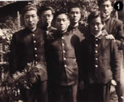 1950年。京都大学学部生の頃、京都一中の同級生たちと一緒に(前列中央)。左端は、三宅章雄・現カメリーノ大学(イタリア)教授。