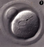 培養によって成熟したマウスの卵細胞。矢印は、染色体の集合を示す。頂点にある小球は第一極体。