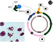 その後、M.ローカ、J.マラー、T.ハント、J.ルーダマンなどの分子生物学者たちの研究によって、精製したMPFは2つのプロテインキナーゼ活性キナーゼリン酸化させることによってその分子の働きを変化させる酵素。をもったタンパク質の複合体だということがわかった。驚くべきことに、その一方は、P.ナースが分裂酵母から見つけた細胞周期を調整するタンパク質、cdc2と同じ。もう一方は、T.ハント、J.ルーダマンによって二枚貝やウニ卵で、その後キンギョ、ヒトデ、酵母などで見つかり、細胞周期に同調してその量が変化することがわかっていたサイクリンだったのだ。