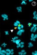 細胞内のヒト人口染色体。(矢印)赤と緑の蛍光色素で染めている。青く染まっているのはヒト染色体。