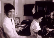 40年代から、欧米では、W.M.スタンレー スタンレー(1904~71)アメリカ。生化学者。カリフォルニア大学ウィルス研究所長。タバコモザイクウィルスを結晶として分離した。1946年ノーベル化学賞受賞。、M.デルブリュック デルブリュック(1906~81)ドイツのちにアメリカ。物理学、分子生物学者。1969年ノーベル生理医学賞受賞。ファージの遺伝的組換えを発見するなど、ウィルス遺伝学の基礎を築いた。、S.E.ルリアルリア(1912~91)イタリアのちにアメリカ。分子遺伝学者。1969年ノーベル生理医学賞受賞。細菌とファージの遺伝学の基礎を築いた。などによってウィルスの本質がわかり始め、新しい遺伝学、分子遺伝学が盛んに研究されるようになっていました。私のウィルスへの興味は、生物の生物たるゆえん、自己増殖が一番単純な形で提示されていることでしたから、まさにそのような研究がしたかったのですが、日本では、医学的見地から病原体としての研究が大勢を占めていました。釜洞研ではワクチニアウィルス(無毒化した天然痘ウィルス)を研究していましたが、とにかくウィルスを用いて、生物理解のための研究をしようと考えて化学科のクラスメートであった妻の照子と一緒に研究を始めました。