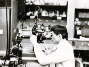 バークレーで。トランスフォーメーションした細胞を顕微鏡で観察している。がりがりに痩せていた。