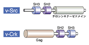 88年にCT10というニワトリ肉腫ウィルスでがん遺伝子v-crkがみつかったのでv-crkとv-srcの作るタンパク質を細かく比べてみたところ両方に共通に存在し、細胞内の情報伝達系で重要なはたらきをするタンパク質(SH2やSH3)の存在が明らかになりました。これはがんの仕組みの解明であると同時に、その後、細胞のはたらきの基本ともいえるために急速に盛んになったシグナル伝達の研究を開くものでもありました。