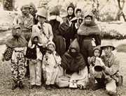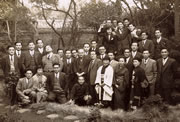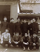 56年、正月に自宅庭にて医局のスタッフと。前列左から4人目、本人。その後ろが父。前列右から2人目が母。