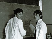 博士課程の頃。後輩の安武君と黒板を使って議論。(左)