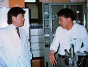 88年、利根川博士が実験動物中央研究所を訪問。(右:本人)