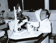 実験動物中央研究所にて顕微鏡とともに。