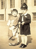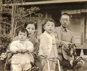 4歳、鎌倉稲村ケ崎の別荘にて。右:本人と叔父の加納六朗(後の東京医科歯科大学長)、左:母と妹。