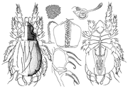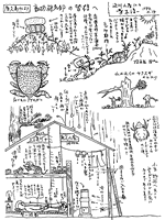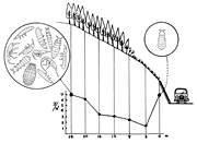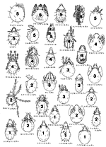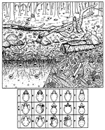 拾い取り法で調べた森林に住む土壌動物の種組成。林床のさまざまな堆積物〔植物遺体〕にはそれぞれ別の種のササラダニが生息し、分解に関与している。群馬県榛名山で調査。このイラストはヨーロッパの研究者に引用された。