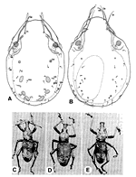 ニューギニアの森林にすむゾウムシ。背中に白っぽく見えるのは着生した地衣類(図C~E)。その背中に着生する地衣類の上に生息する珍奇なササラダニ(A雄、B雌)。