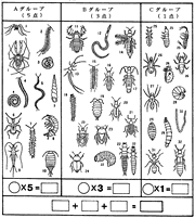 土壌動物による自然環境診断。32種類の指標動物が全て観察されれば100点となる。