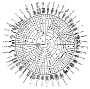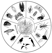 土壌動物の円盤検索図。足の数を問う中心部からはじめて、円周上の答え(イラスト)にたどり着く仕組み。