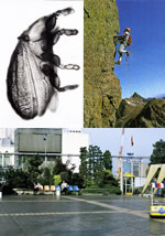 デパートの屋上(下)からみつかったシワイボダニ(上左)の故郷は、断崖絶壁(上右)と推定される。