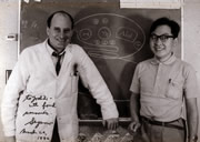 ベンザー博士と記念写真。帰国直前に撮ったもので、後ろの黒板にはモザイク解析の成果が書かれている。