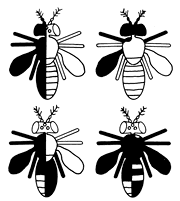 モザイク解析の考え方。黒は正常な遺伝子を持つ部分、白は変異遺伝子を持つ部分を示す。眼の遺伝子型と体の遺伝子型が一致していない個体を調べ、眼の機能異常がどちらの遺伝子変異によるものかをみわける。イラストは直筆で、いかにショウジョウバエを可愛く見せるかに苦労した。