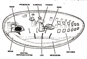 モザイク解析の手法を用いて作った発生運命予定図。成虫の構造が、胞胚のどの位置に由来するかを示した。