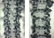 グリア細胞がなくなる変異体 glial cells missing(gcm)。正常な胚(左)と変異体の胚で、グリア細胞になる予定の細胞を黒く染めたもの。変異体では、グリア細胞になるはずの細胞が、神経細胞のように神経突起を伸ばしている。