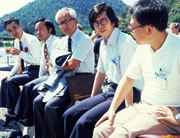 1978 年、国際生物物理学会議(京都)にて。左から大沢文夫(名古屋大・大阪大名誉教授)、宝谷紘一(名古屋大名誉教授)、和田昭允(東京大名誉教授、現横浜こども科学館長)、広海健(現遺伝研)、本人。