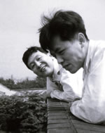 三菱化成生命科学研究所の前で。左から本人、江上不二夫先生。