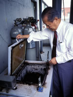 新しい好熱菌探しはライフワークと言えるかもしれません。初めに分離したThermusは中性の熱湯で暮らす好熱菌ですが、他に酸性環境に耐える菌も探しました。DNAは酸性に弱いが、RNAはむしろアルカリに弱い。だから、酸性で高温な環境に暮らす生きものを探したらRNAを遺伝子として使う生きものが見つかるかなと思ったのです。でも、世の中それほど甘くはありません。今のところ、RNAを遺伝子としているのはウィルスだけ。RNAを遺伝子にする生きものは夢に終わりました。でも、好熱性、好酸性の古細菌発見という収穫がありました。分離は三菱化成生命科学研究所(現三菱化学生命科学研究所)にいたころやりましたが、基本的な性質は東工大に移ってから決めました。その名もSulfolobus tokodaiiです。生化学的な解析だけでなく、ゲノム解析など、幅広く研究しました。みつけたのはpH2.5~3くらいの箱根大湧谷の温泉。手が届く限りは柄杓ですくい、後は、細いチューブの先につりに使うおもりをつけて、ほうりなげます。嫌気性でとりたいときはこれに大きな太い注射器つけておき引くと、初めの部分を捨てれば、後の方はほとんど酸素に触れない状態でとれます。もう一つ、別府温泉のみょうばん泉のpH1近くのところでも探しました。酸性が強いので手にちょっとしたささくれがあるだけでも痛いんですよ。今では厚生省の指導により泉源に川の水を引いて中性に近づけているようです。