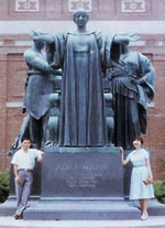 イリノイ大学に留学。大学のシンボル Alma Mater 像の前で夫人と。