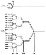 一つは複製と細胞周期の関係です。細胞がDNAを合成する速度は、複製開始の頻度と複製伸長の速度によってきまります。このうち伸長速度は、栄養状態つまり細胞の増殖速度とは無関係に一定であることが分かりました。ですから、DNA複製の周期と細胞増殖の周期を調和するには、複製開始の頻度を調節しなければなりません。つまり栄養条件が良いと開始頻度を多くし、栄養条件が悪いと開始をとめることもあるのです。一方、普通の栄養状態のときに複製酵素の阻害剤を加えるなどして複製の伸長速度を遅らせると、相対的に開始頻度が増えたことになるので、次々に複製開始点が増幅したやまたのおろちのようなゲノムを作ることが出来ます。この図は複製開始と細胞周期の密接な関係を示すものとして、よく引用されました。