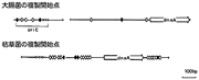 大腸菌と枯草菌の複製開始点の比較。短い黒矢印はdnaAタンパク質が結合する9塩基配列(TTATCCACA)を、短い白矢印はそれと類似した配列の存在を示す。またdnaAと書かれた矢印は、dnaA遺伝子を示す。大腸菌の複製開始点(oriC)は短くまとまっており、dnaA遺伝子とも離れた場所にある。枯草菌の複製開始点は、多くのdnaA結合配列とdnaA遺伝子を含む長い領域となっている。