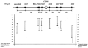 (上)出芽酵母第6染色体の構造。白丸はセントロメア、黒丸は複製開始点を示す。(下)細胞周期がスタートした時を0分とし、それから何分後の間にどの複製開始点でDNA複製が始まったかを、上図の複製開始点に対応する縦線で示した。複製は染色体の中心付近の開始点から始まり、両端の複製開始点は最も遅く始まる。