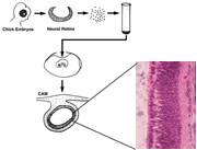 ニワトリ胚の網膜をバラバラにし、細胞塊を別の発生中の卵内で培養する実験。秩序だった網膜の層構造が再生される。