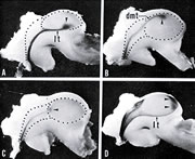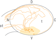 イモリを用いて、眼と脳を結ぶ視神経の投射パターンの観察に初めて成功した。A,B,C,Dはそれぞれ、網膜の背側、腹側、鼻側、側頭側からの視神経が視覚中枢(点線で囲っただ円部分)のどこに伸びているかを示している。