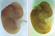 ニューロピリンのノックアウトマウス。軸索を茶色く染めてみると、正常胚(左)ではきちんと束ねられている軸索が、ノックアウトマウスではバラバラになってしまった。