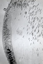 ニワトリ胚の水晶体。左が上皮組織で、右側には繊維組織が見える。