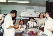 京都大学生物物理学教室。1980年頃の風景。左端で白衣を着るのは岡田先生。(右から2人目:本人)