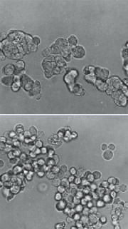 カルシウム存在下では集まった細胞どうしがしっかりと接着しているが(上)、カルシウムがないと接着がゆるくなる