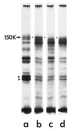 細胞接着現象に関わるタンパク質の存在。カルシウムイオン存在下で接着性を示す細胞(b)とそうでない細胞(c)の膜タンパク質の組成を比較した。bには分子量150Kダルトンのタンパク質が大量に存在している。