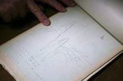 ヒマワリの曲がり具合を測った手作りの分度器と当時のスケッチ。長方形の紙に糸を貼って重りを垂らし、ヒマワリの傾きに紙を合わせた時の糸の位置を記録して後から角度を計算する。