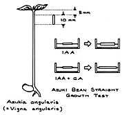僕の仮説が正しければ、コルヒチン処理はジベレリンの作用を無効にするはずです。オーキシンとジベレリンの混合液にコルヒチンを加えると、確かにオーキシン単独の時のようにアズキの茎が太りました。セルロース合成を阻害しても同じことがおこるはずですが、当時セルロース合成を特異的に阻害する薬剤は知られていませんでした。