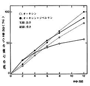 茎の重さの時間経過。オーキシンのみの場合、茎の伸びは時間と共に頭打ちになるのに対し(○実線)、重さは増加しつづける(○破線)。つまり茎は太っていることになる。