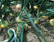 春に伸びたタマネギは、夜の長さが短くなると茎の根元がふくらみはじめる。