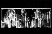アズキの茎細胞の微小管を蛍光顕微鏡で観察したもの。細長い細胞の中に白く見えるのが微小管。切り出した直後はいろいろな向きに並んでいる微小管(A) が、水に浸けると縦に並び(B)、オーキシン処理すると縦から横へ、横から縦へ、再び縦へと方向を変化させる(C – E)。