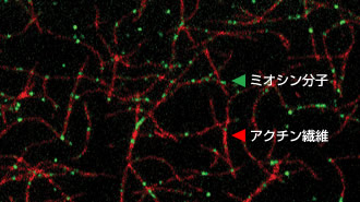 網目状の赤いアクチン繊維に沿って緑のミオシン1分子が運動する様子を観察できる。