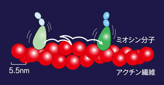1分子観察の研究から、左図のようにATPを1個消費する間にふらふらと動くミオシン分子の姿が明らかになった。