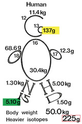 生体分子に含まれる安定同位体の比率を図示した”Isotope Person(同位体人間)”。体重50kgのヒトの場合、軽い12Cが11.4kg含まれるのに対し重い13Cが137g含まれる。同様に、酸素(O)、窒素(N)、重水素(D)の含有率を合わせると、225gの重い同位体を持っていることになる。