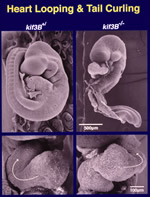 多様なKIFの一つ一つを丁寧にみていったところ、思わぬ展開がありました。KIF3は神経細胞以外にも多くの細胞に発現しており、このはたらきを調べるためにKIF3ノックアウトマウスを作製したのです。KIF3がはたらかなくなったマウスは生まれてくる前に死んでしまい、神経管が閉じないことや心臓をはじめとする循環器系に問題があるなどいくつかの異常があります。しかもこの時、このマウスには体の左右が逆になっている個体が半分いることに気づきました。不思議な表現型です。モータータンパク質と体の左右にどんな関係があるのか、すぐにはわかりません。