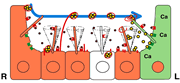 ノードの繊毛は回転し、胎仔外液に右から左への流れを生じさせる。これがきっかけとなって左右非対称な発生が起こる。