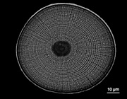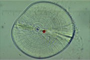 アユの耳石。赤丸は孵化した時点を示す。