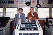 98年には、マックスプランク研究所の動物行動学者ハンス・フリック博士も小型潜水艇JAGO号をもって参加。白鳳丸ブリッジにて。