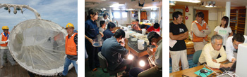 口径3メートルの網(左)を使って膨大な量のプランクトンサンプルを得る。それを丹念に選別し、透明なウナギの卵や仔魚を探す(中央)。採集後、すぐに船内でDNA解析し、ニホンウナギか否かを確認する(右)。